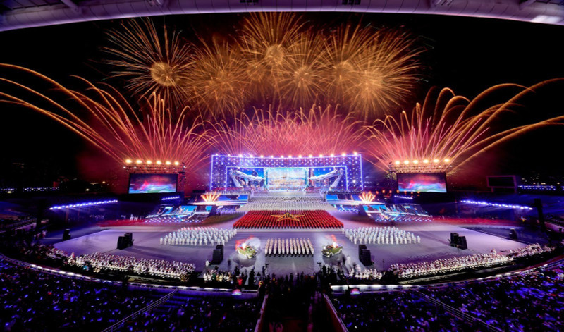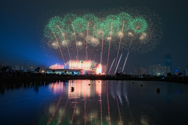 Ở những cao trào của chương trình, hàng nghìn quả pháo hoa tầm cao đồng loạt khai hỏa, kết hợp hệ thống giàn phun hỏa thuật trên mái và hai cánh khán đài, đẩy cảm xúc khán giả lên đỉnh điểm. Cuối chương trình, bầu trời Mỹ Đình rực sáng với màn pháo hoa tổng lực, đa sắc màu, được lập trình chính xác đến từng phần nghìn giây, tạo nên khoảnh khắc thị giác mãn nhãn và đầy xúc cảm.